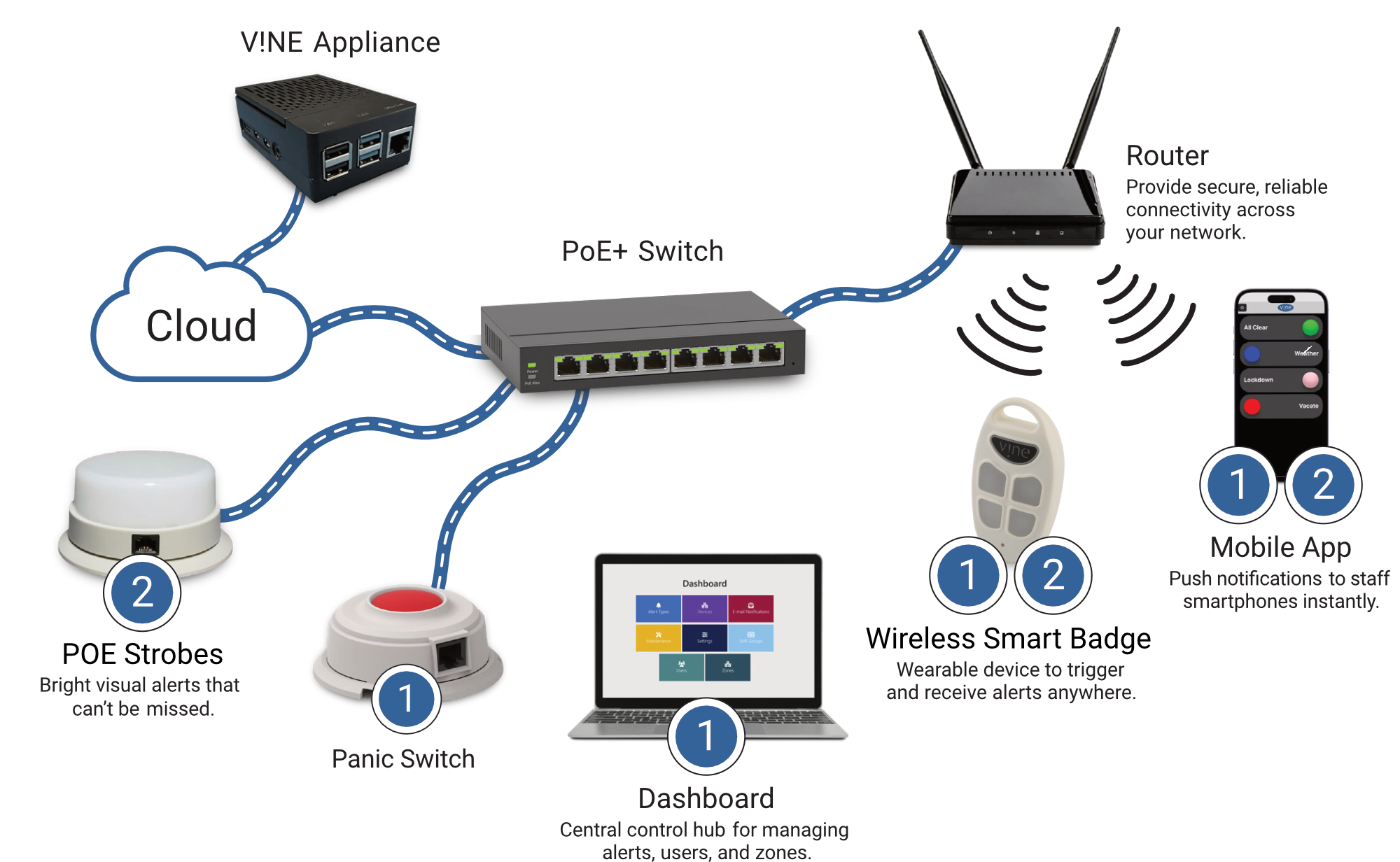 V!NE brings together bright PoE+ strobes, wearable Smart Badges, panic buttons, and mobile alerts into one simple system. When an alert is triggered, every connected device activates at once, so your team is instantly notified, no matter where they are in the building. Whether it is an emergency or an everyday need, V!NE keeps communication